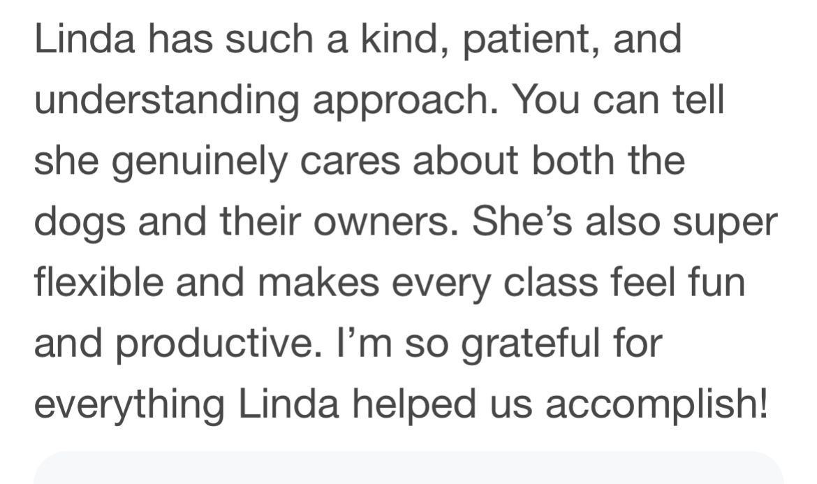 "Linda is very patient and was good with constructive comments. We learned quite a bit in the 6 week training course. Being consistent with command words is very important and to use different words for different commands not to confuse the dog. For instance DOWN to lay down and OFF to get off (whether its off of you or furniture etc). Linda was interested in helping each of us with our dogs individual issues and gave many good recommendations. It was a pleasure working with her."