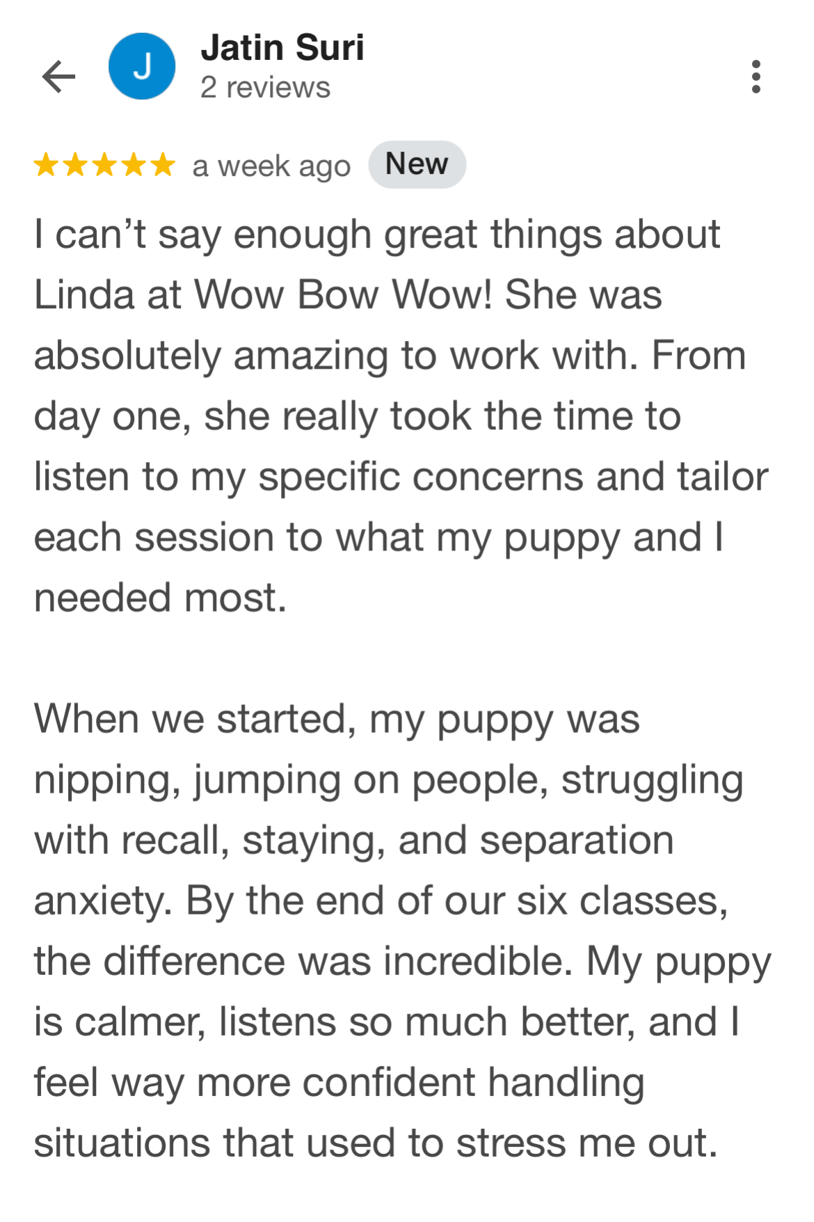 "Linda is very easy to work with and is a wealth of knowledge with dogs and dog behaviors. She is very thorough and has great follow up. We are very happy with our puppy training experience." --Jennifer & James