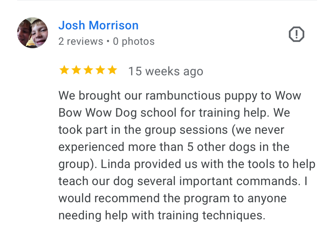 "Linda Kwoun was a wonderful supportive teacher for my Rambunctious Puppy. Ruby is far more socialized than she was before this class and much easier to handle because of what I learned." --Lee